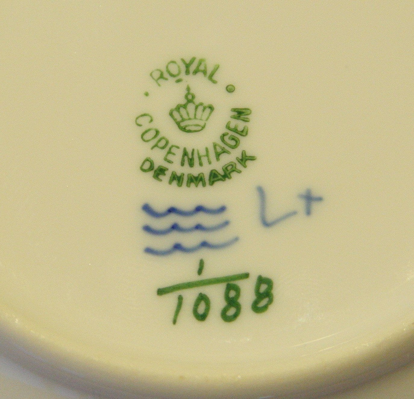 A beautiful set of 6 small Royal Copenhagen hand-painted blue Fluted Full Lace plates, ideal for use as dessert, bread or salad plates. Made in Denmark. Factory 1st. The plates are marked with the Royal Copenhagen hallmark, which dates them to 1951, and the form and pattern number 1 / 1088.