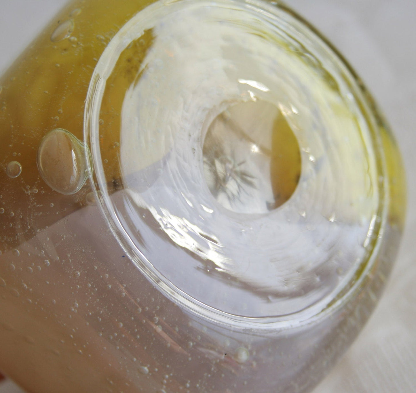 An awesome modern square yellow and white art glass vase, designed by Hanna Hellum and made by Randsfjord Glass in the 70s. The vase is made of a mix of yellow and white glass with a clear glass coating, in a simple swirl design with lots of bubbles in the glass.