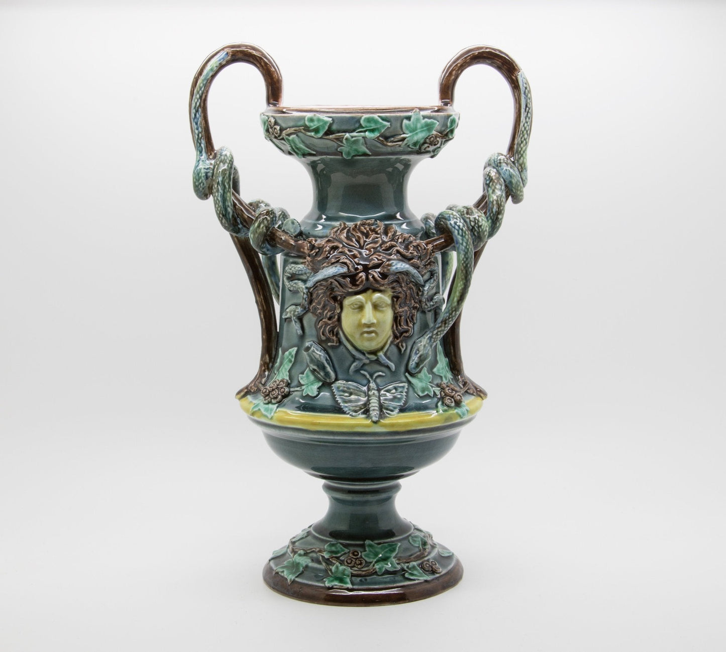 A stunning Rörstrand majolica handled urn vase, decorated on both sides with the head of Medusa, snakes coiling around the vase and the handles, with foliage and ivy, as well as moths, decorating the surface of the vase. Unknown designer, but clearly inspired by Palissy ware, made in Sweden. The vase is marked with the Rörstrand "Iron Stone China" hallmark in use from 1859 to 1869, an impressed AT and EA.
